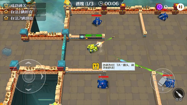 3、使用方向键控制坦克移动,点击攻击按钮发射炮弹消灭敌人。