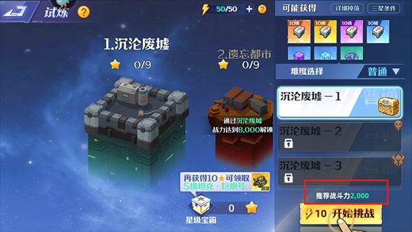 2、点击开始挑战,上面会显示推荐战力,需根据自身战力判断能否通关。