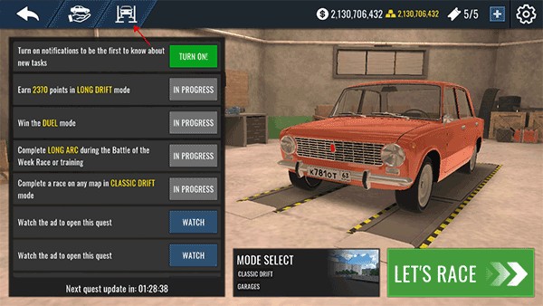4、购得新车后,点击车库选项,在这里你可以为自己的汽车升级配件;