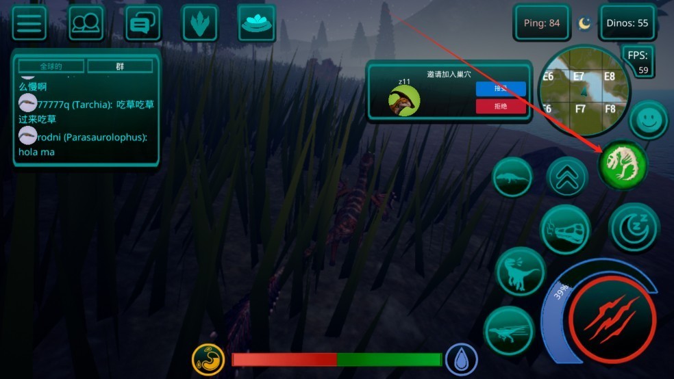 7、你可以搭建巢穴以孵化蛋,并邀请服务器上的其他玩家到你的巢穴(家庭)中,但你的恐龙必须完全成长,并且你的账号需要达到5级或更高。