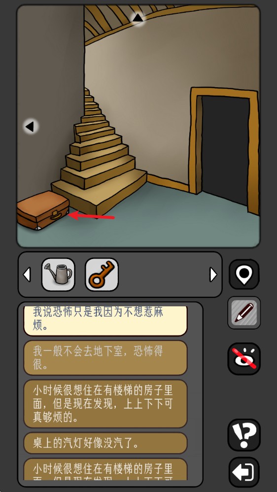 6、返回地下室,点击角落的行李箱,使用【钥匙】打开,获得【斧头】和【汽油】。注意纸条上的箭头和纸张折角的位置:左上-下、右上-左、中-上、左下-左、右下-右。