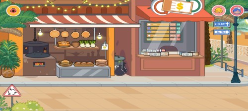4、进入小吃店场景后,可以与店内的食物、设备等元素进行互动,体验场景内的功能。