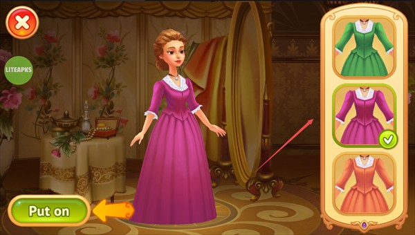 2、你可以选择各种裙子来装扮角色,点击“put on”开始游戏;