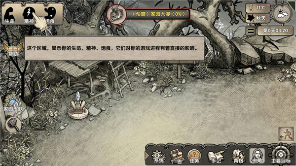 6、界面会显示你的生命值、精神状态和饱食度,这些数值会直接影响游戏进展。
