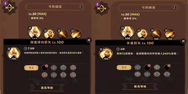 以开8卡后上2阶技能进行分析,结合符文配置,和段落三、弓时装分析是弓强度变化的主要因素。主要围绕突进导向箭矢的质变,其他技能不再赘述。1、2、3技的【增益符文】只会存在单一效果不会叠加,因此只需开启其中一格即可(推荐多重箭矢CD4秒,可常驻)总开格26,100*12+1000*10=11200钻。